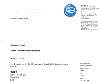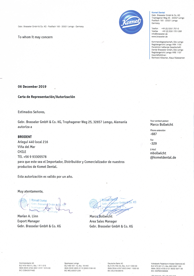 En Septiembre de 2007 nace en Viña del Mar la empresa Brodent dedicada a la importación de productos rotatorios dentales con el fin de entregar a los profesionales de la salud dental los mejores productos existentes en el mercado. Para ello, Brodent comercializa la prestigiosa marca de fresas dentales Komet (Alemania).