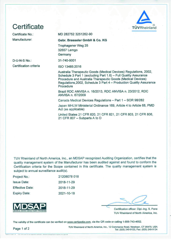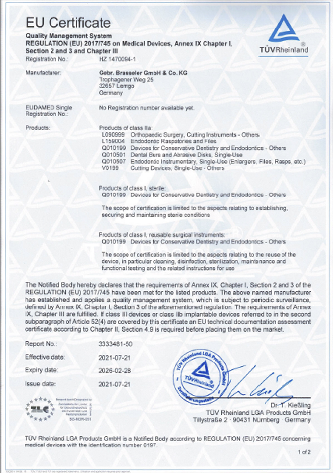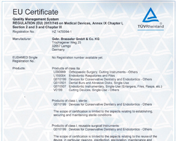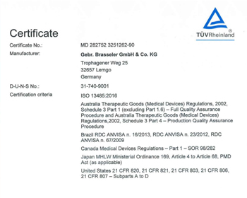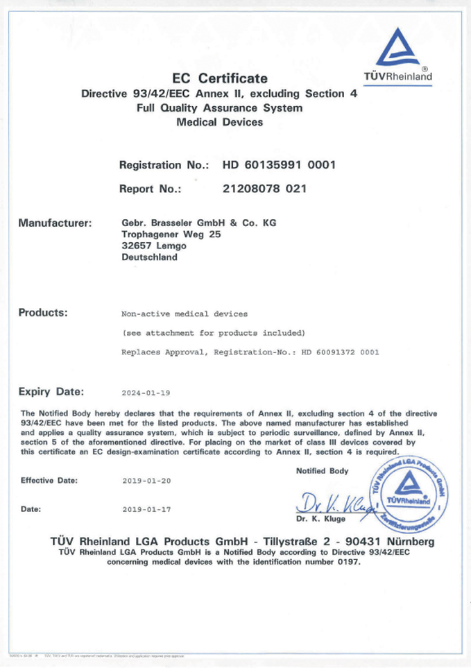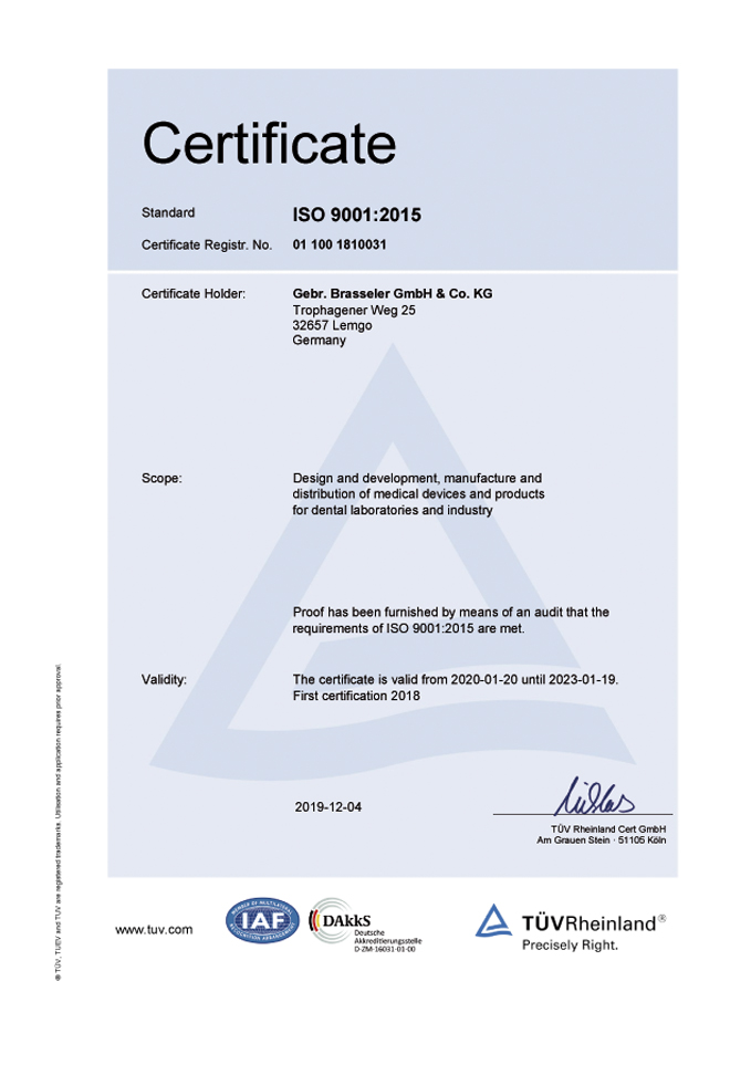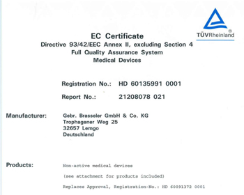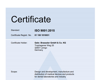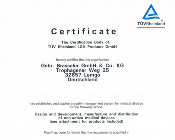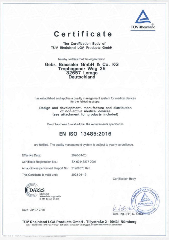 Gebr. Brasseler GmbH & Co. KG mantiene un Sistema de Calidad certificado según las normas EN ISO 9001 y EN ISO 13485 para el desarrollo, la fabricación y la distribución de productos médicos e industriales.